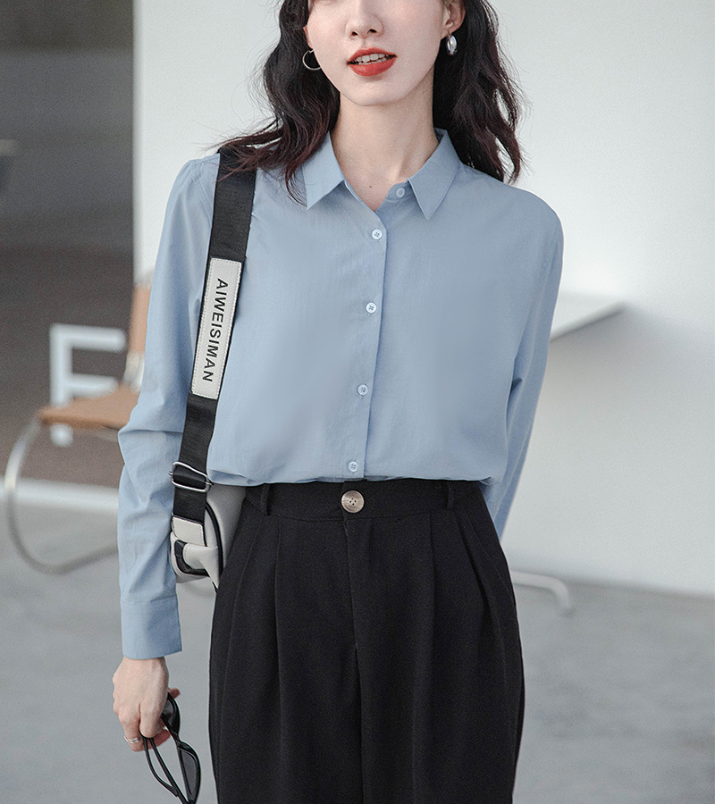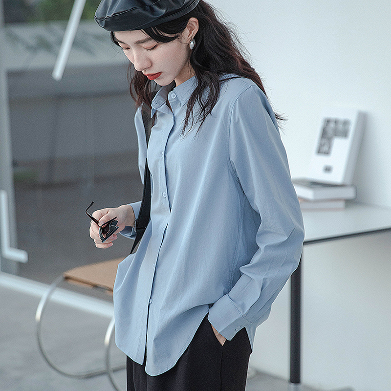 纯色宽松通勤气质长袖 简约翻领蓝色衬衫 衬衣女 新款 2025秋季
