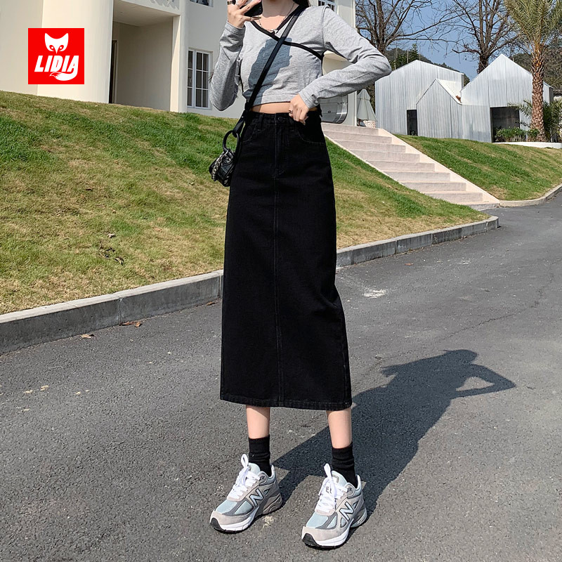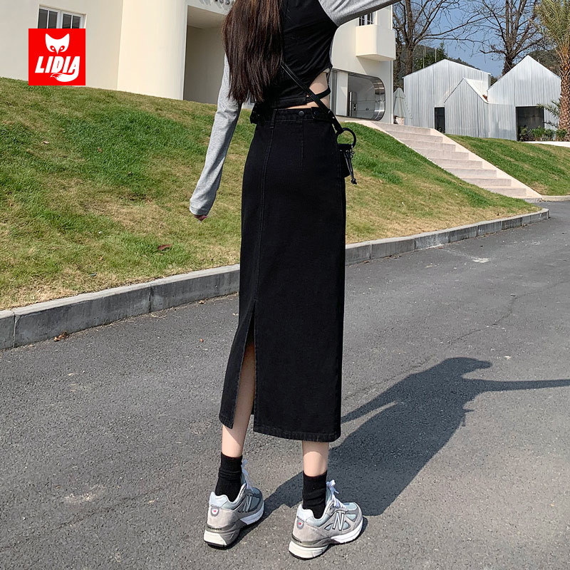 咖啡色高腰开叉牛仔裙女秋季 宽松洋气显瘦弹力A字中长半身裙 时尚