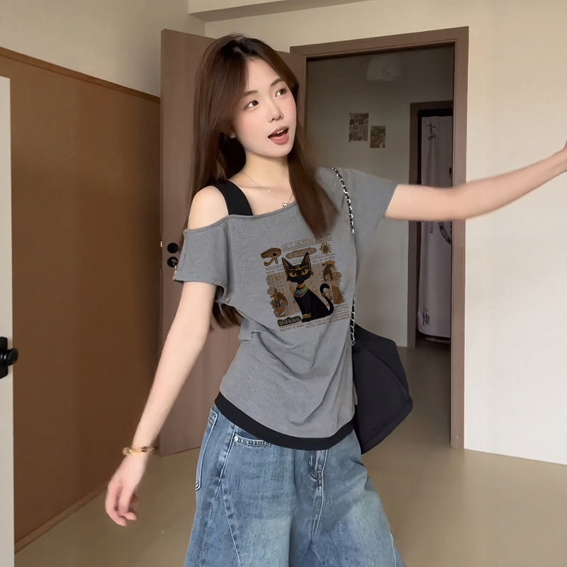 灰色甜辣法式 T恤女ins潮紧身高腰别致露肩上衣 超火超甜假两件短袖