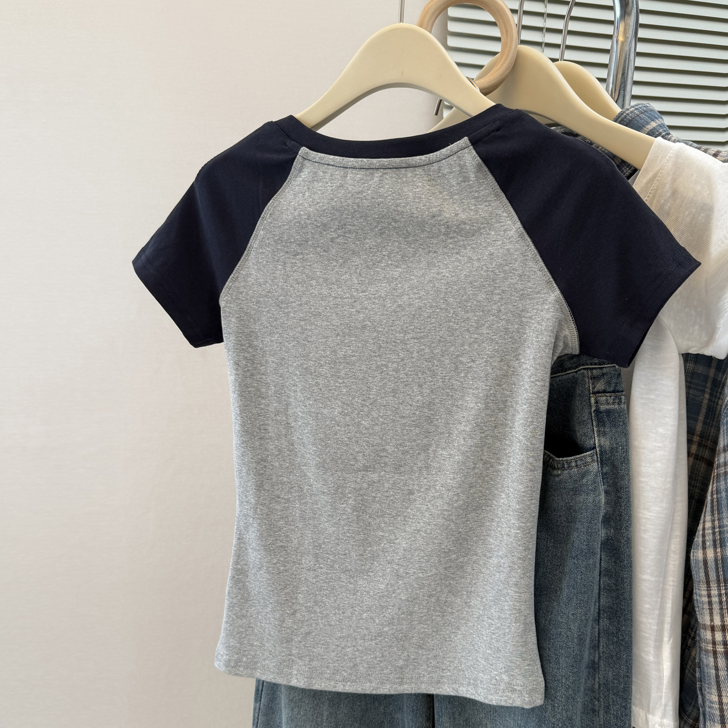 修身 韩版 设计感小众chic别致上衣潮 T恤女夏季 正肩撞色拼接V领短袖