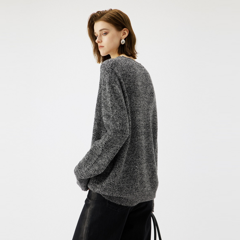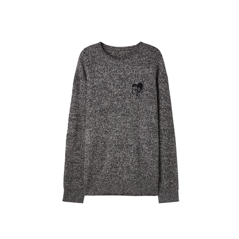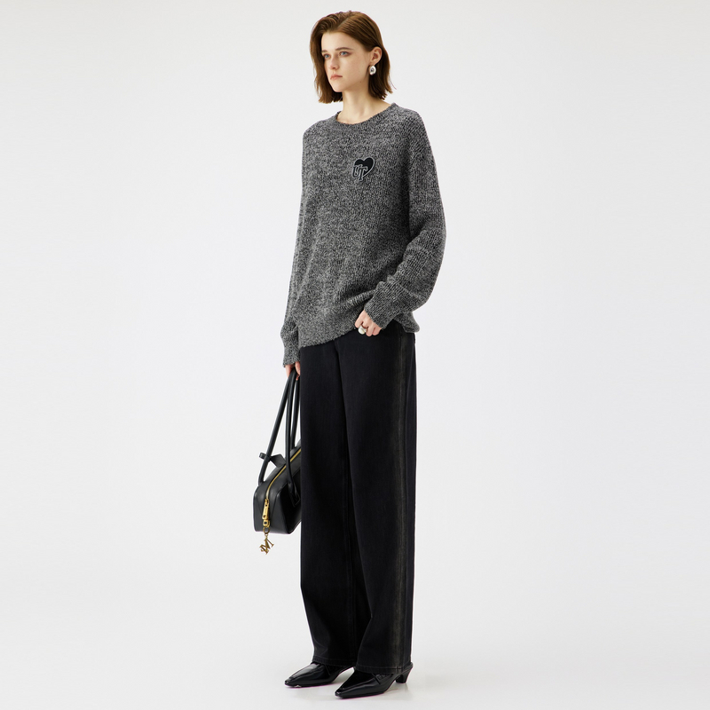 新款 尤缇2025秋季 TI圆领灰色针织毛衣女绵羊毛爱心刺绣套头毛衫