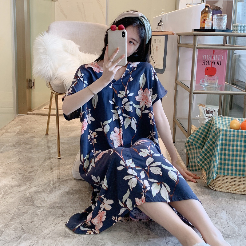 睡衣绵绸连衣裙大码 人造棉短袖 家居 棉绸睡裙女士夏长款 2024年新款
