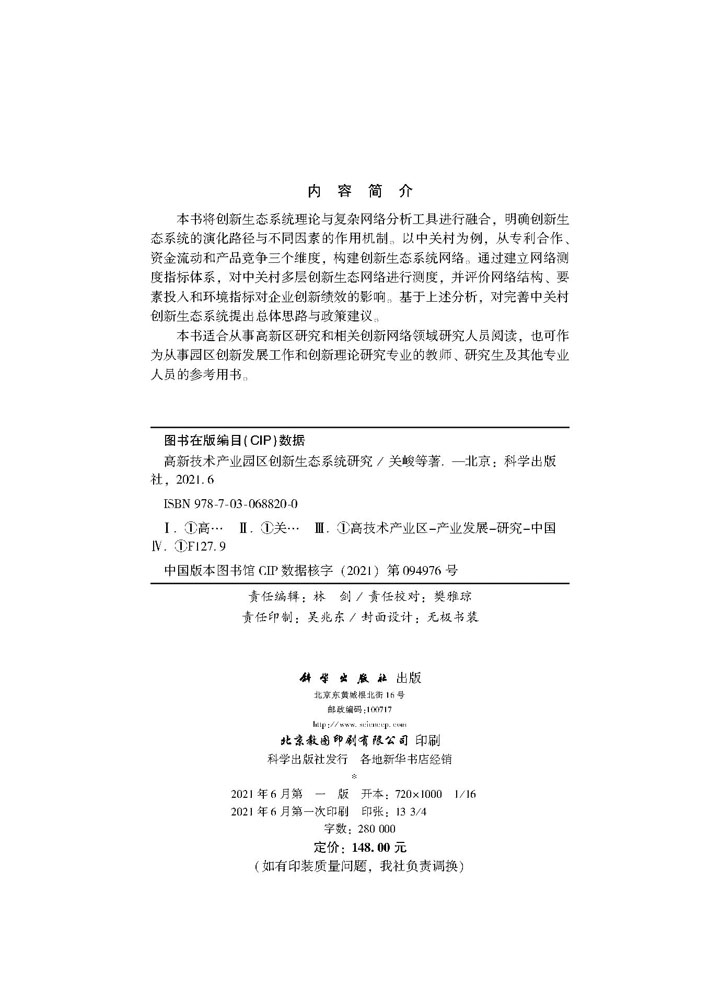高新技术产业园区创新生态系统研究 社 关峻等科学出版