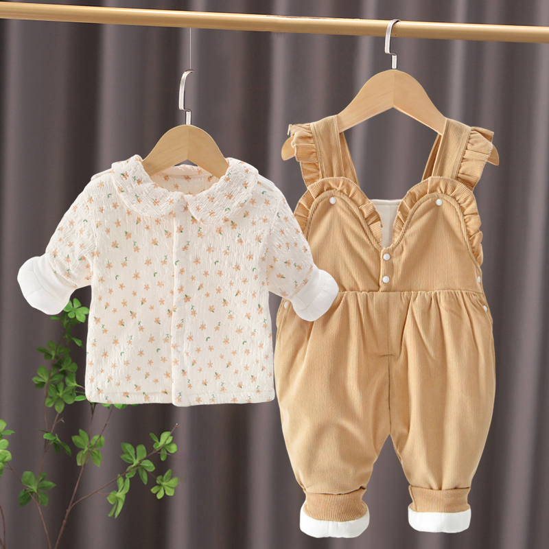 公主洋气外出春秋背带裤 婴儿纯棉长袖 夹棉两件套 套装 女宝宝背带裤