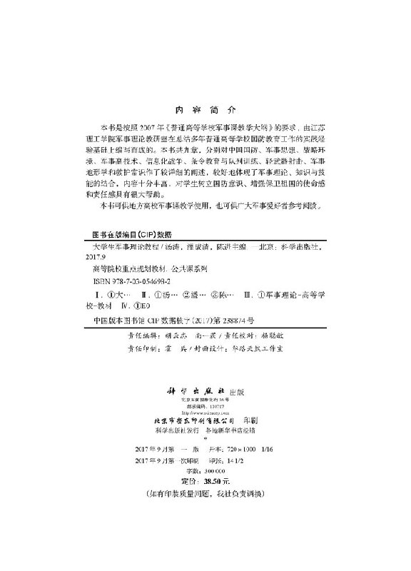 社 陈进科学出版 大学生军事理论教程汤涛 潘成清