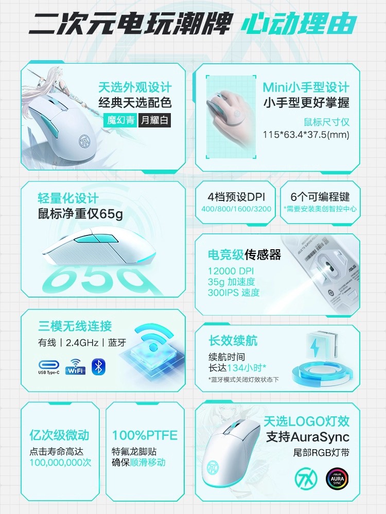 华硕天选游戏鼠标 无线轻量化电竞游戏鼠标对称手型
