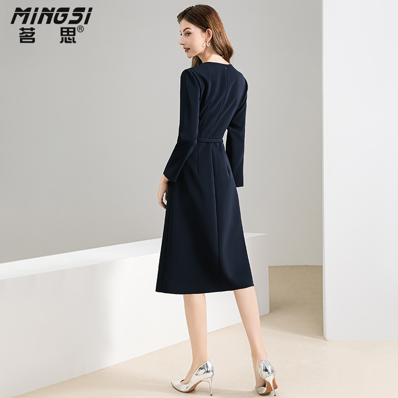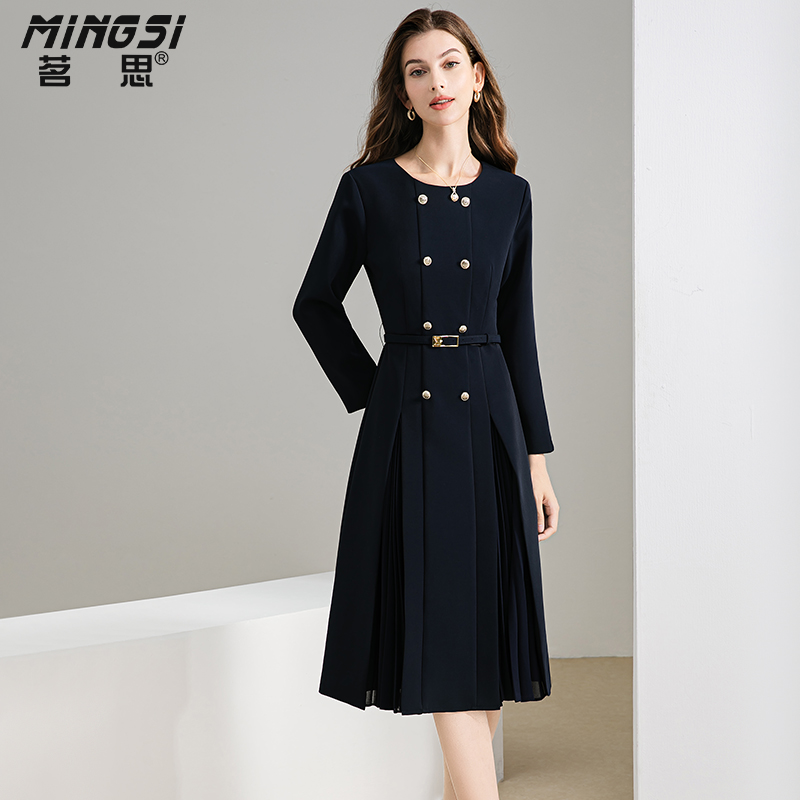 茗思高级感气质通勤连衣裙2024春秋新款 百褶裙子 优雅收腰显瘦长袖