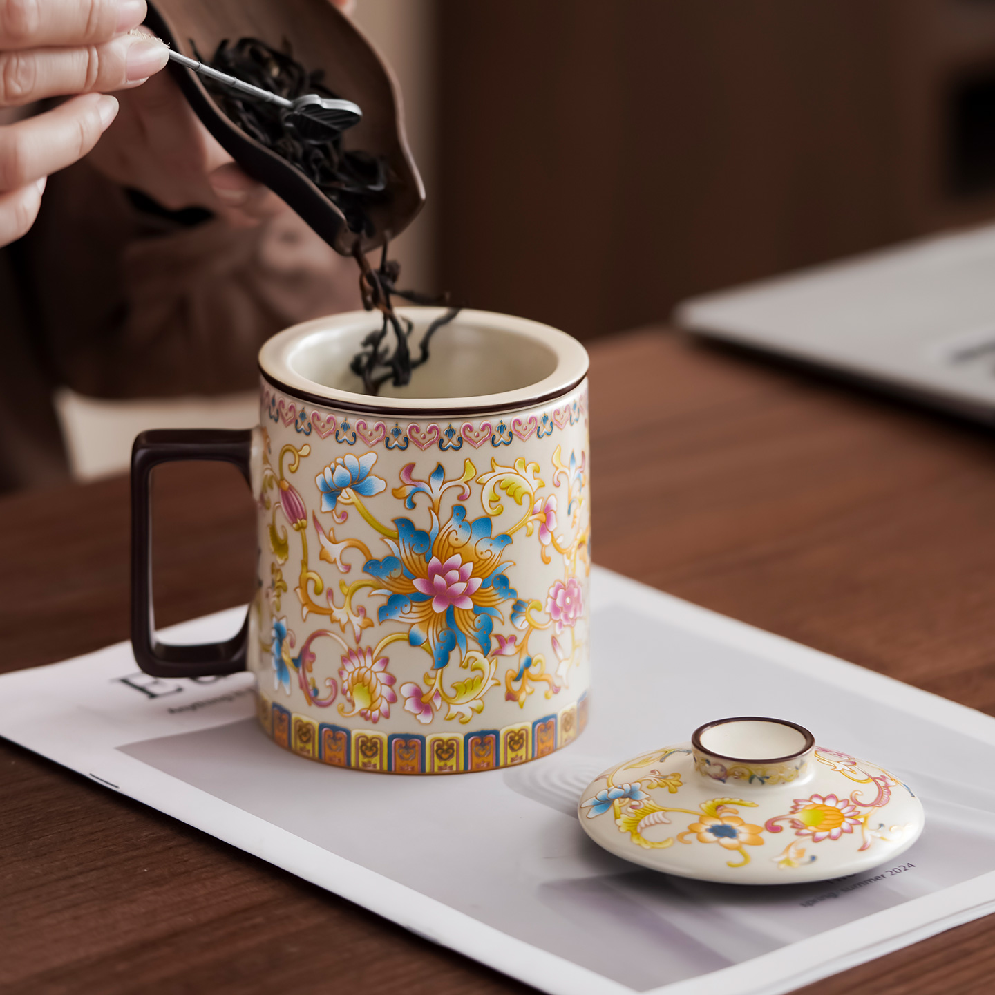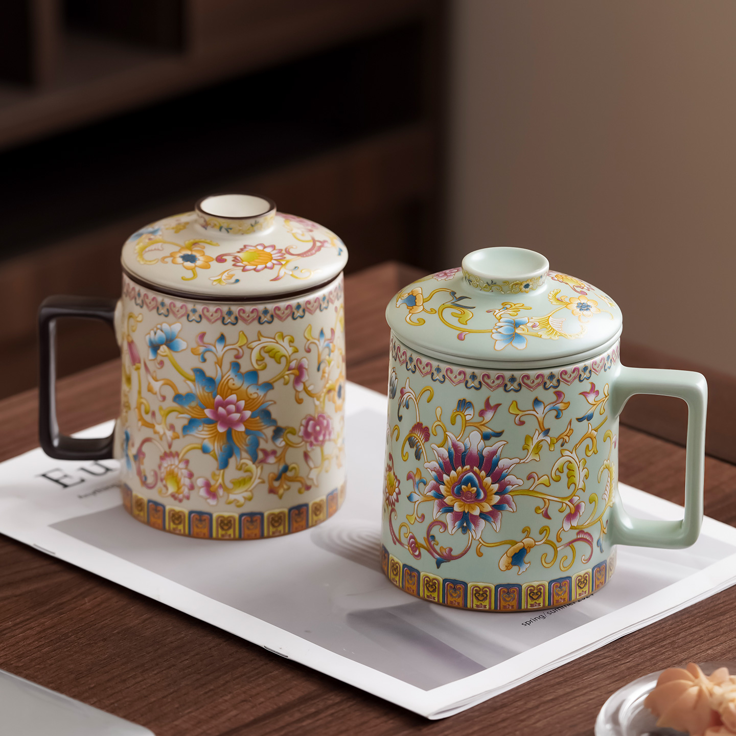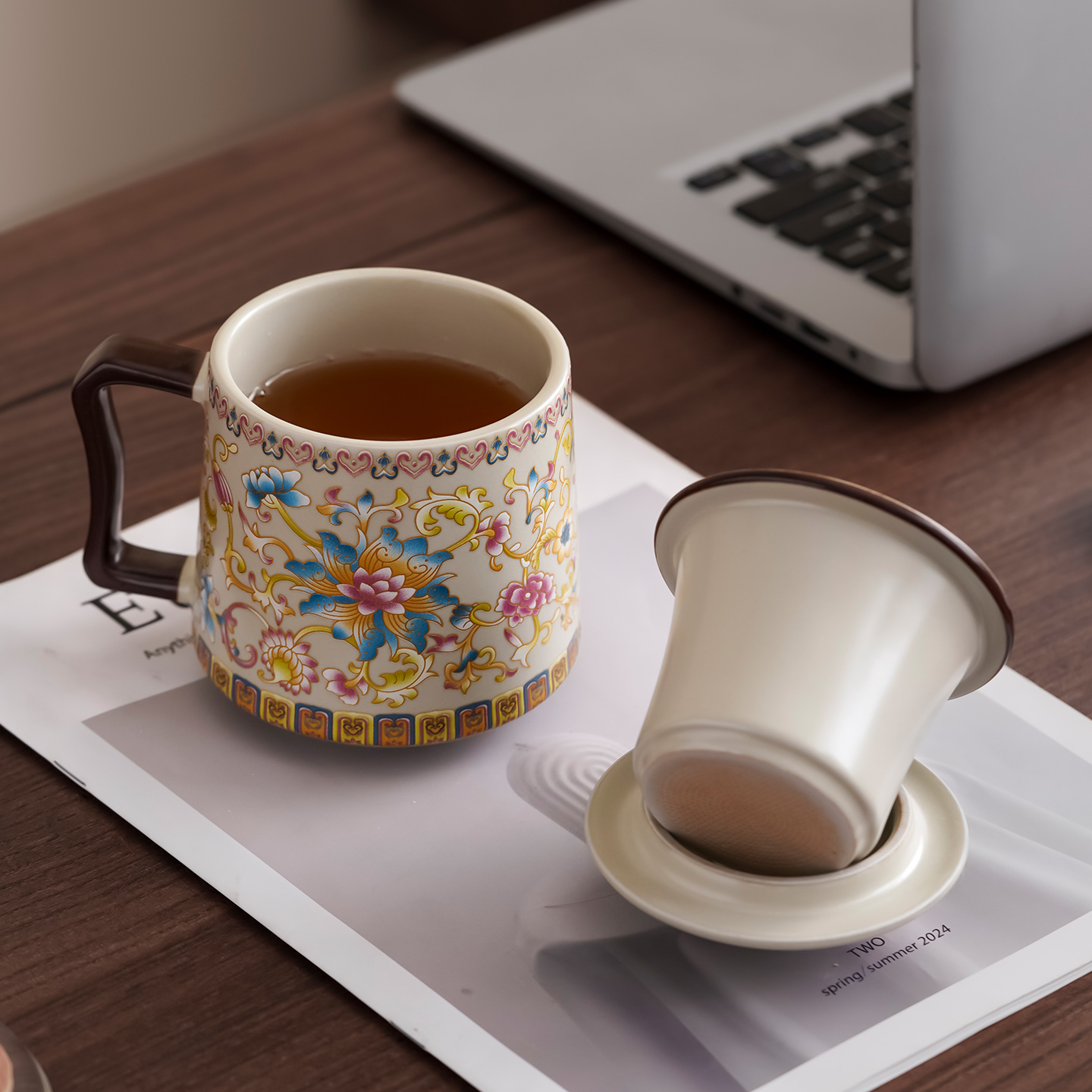 言仓线条小狗泡茶分离杯带滤托陶瓷水杯办公室茶杯生日礼物