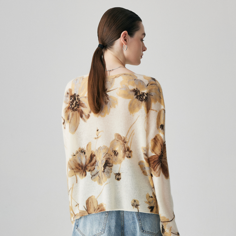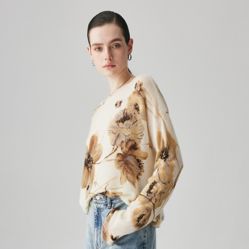 印花针织毛衣 女士一字领甜美风阔版 帕罗2025秋冬新款 100%山羊绒衫
