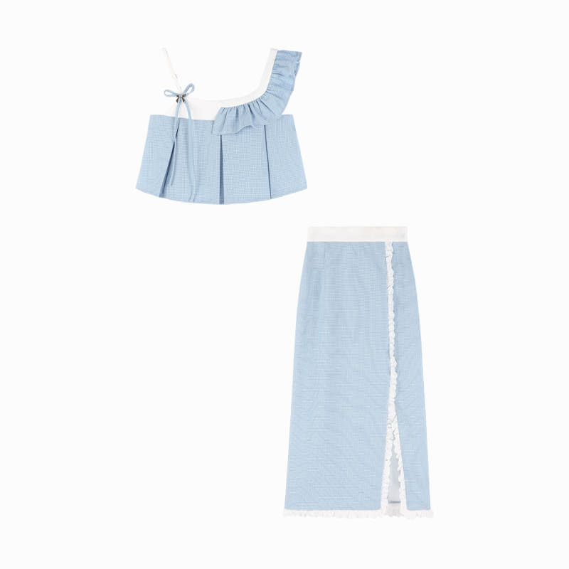 女夏 荷叶边不对称设计感小香风小众别致半身裙套装 清仓价