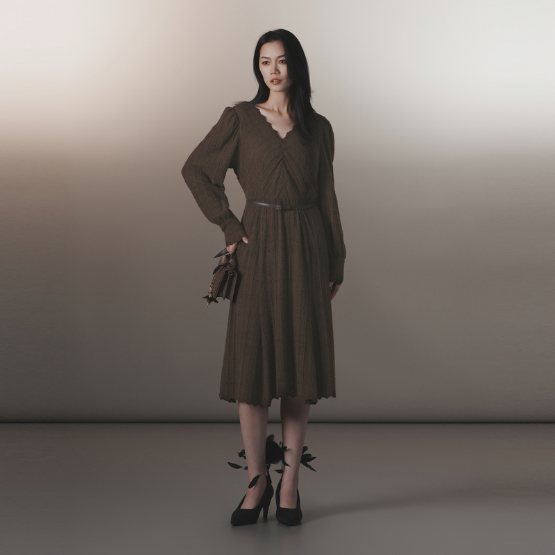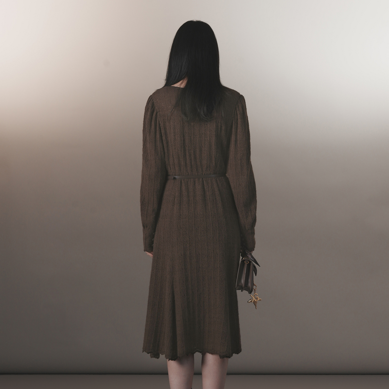 蕾丝镂空高腰中长裙女装 XG雪歌深咖色长袖 新款 冬季 套头连衣裙时尚