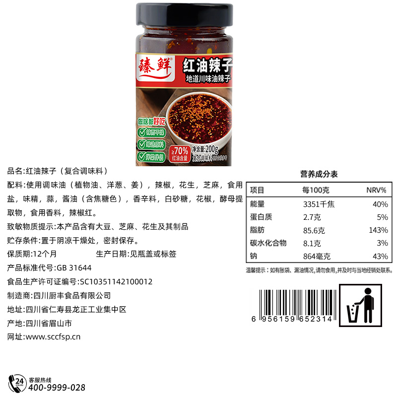 臻鲜红油辣子200g四川辣椒油凉拌汁拌菜料香辣红油辣椒酱 包邮