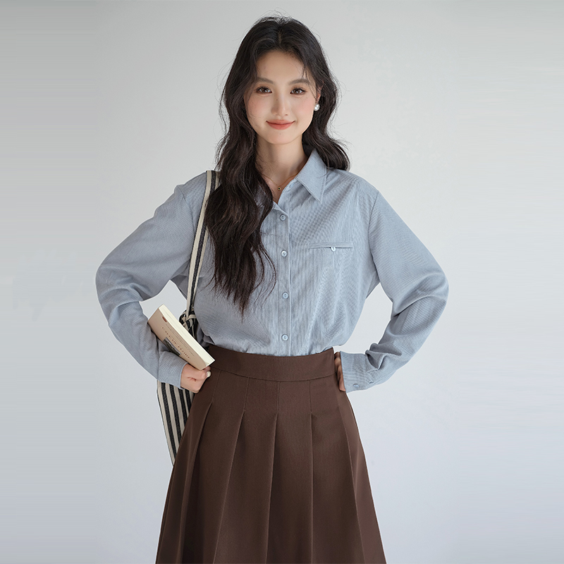 女装 胖mm韩版 气质翻领灯芯绒衬衫 新款 宽松外套上衣 秋季 蓝若水大码