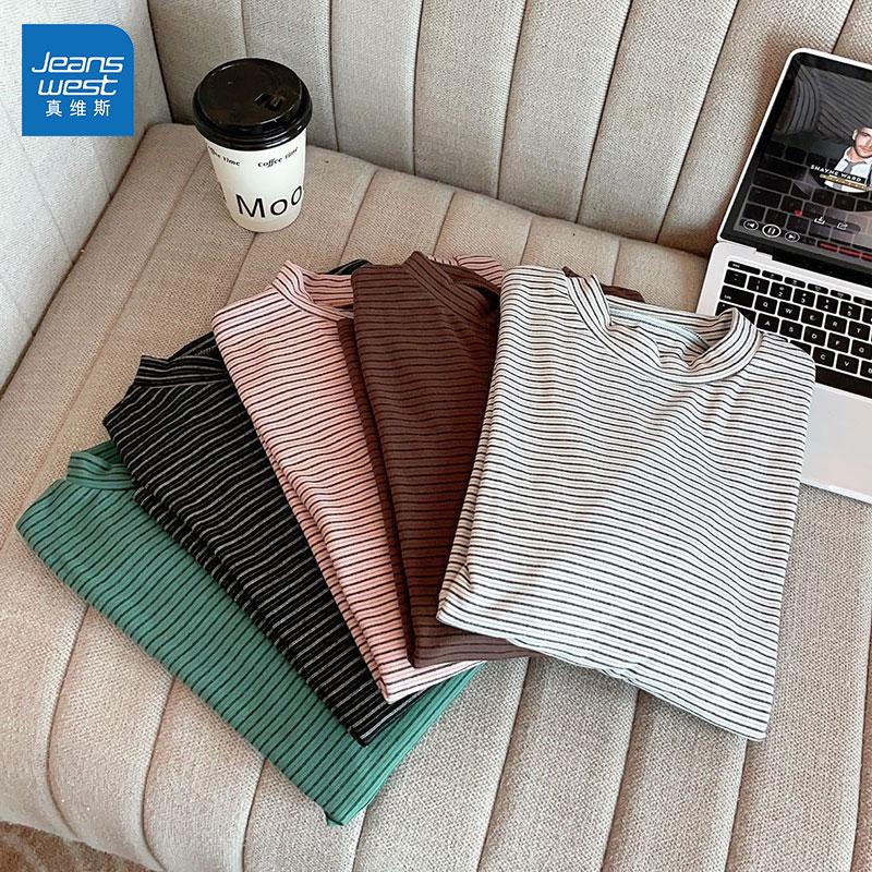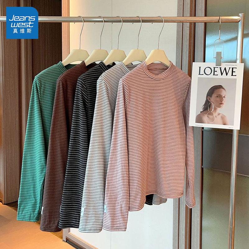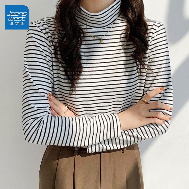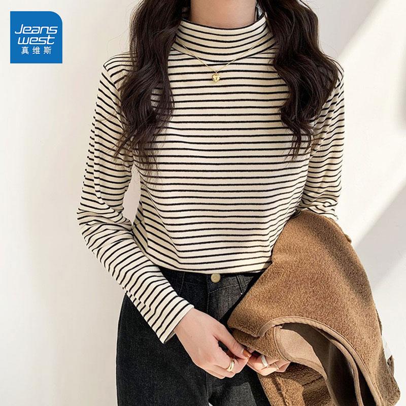 长袖 GL真维斯条纹打底衫 半高领休闲修身 2025新款 上衣T恤 女秋冬季