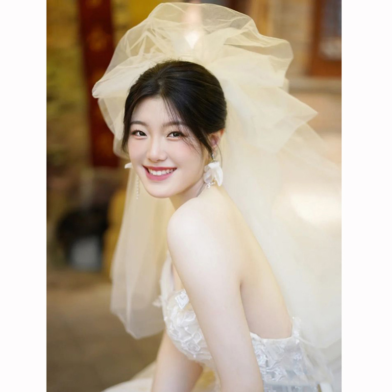 2025新款 新娘摄影造型婚纱跟妆白色 头纱抓纱抓泡云朵蓬蓬头纱韩式