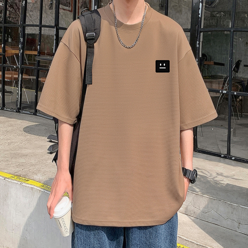 打底衫 华夫格夏季 T恤男潮牌ins休闲体恤港风宽松笑脸半袖 短袖 薄款