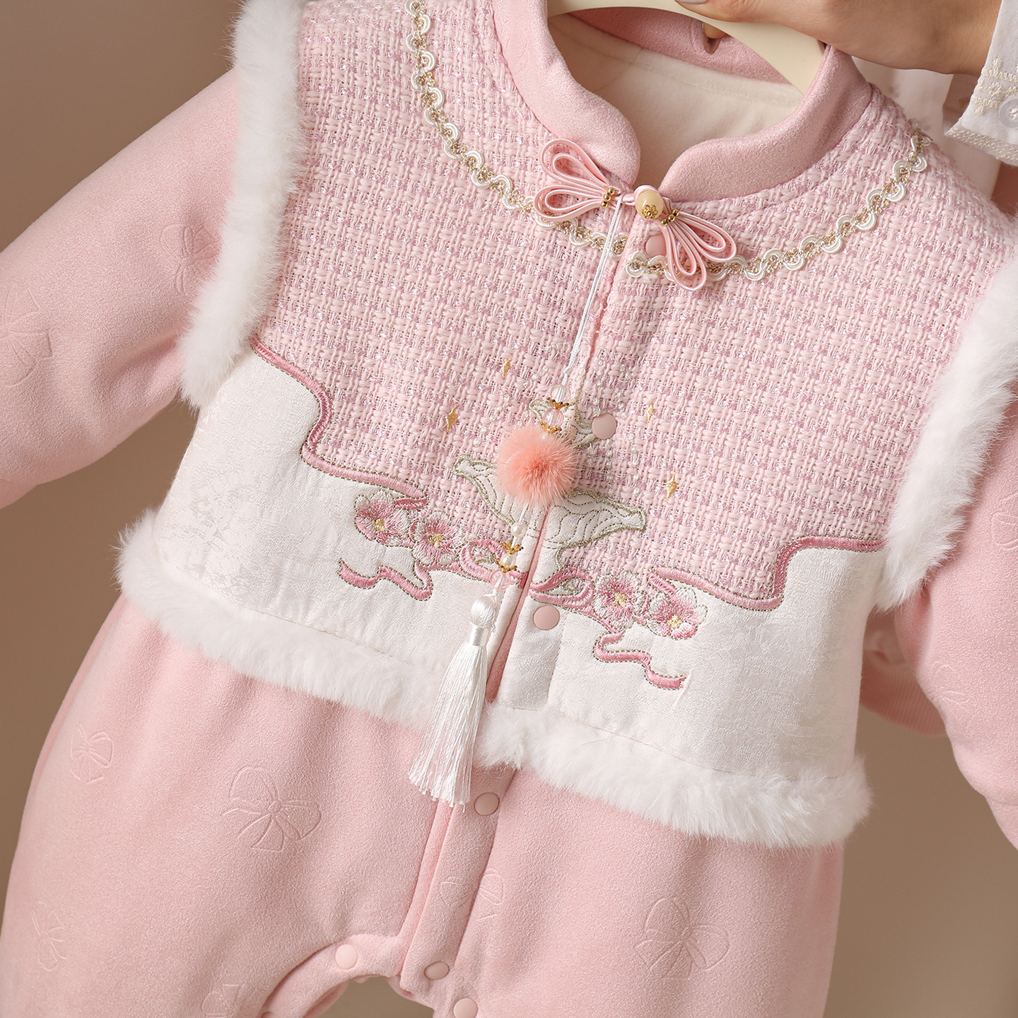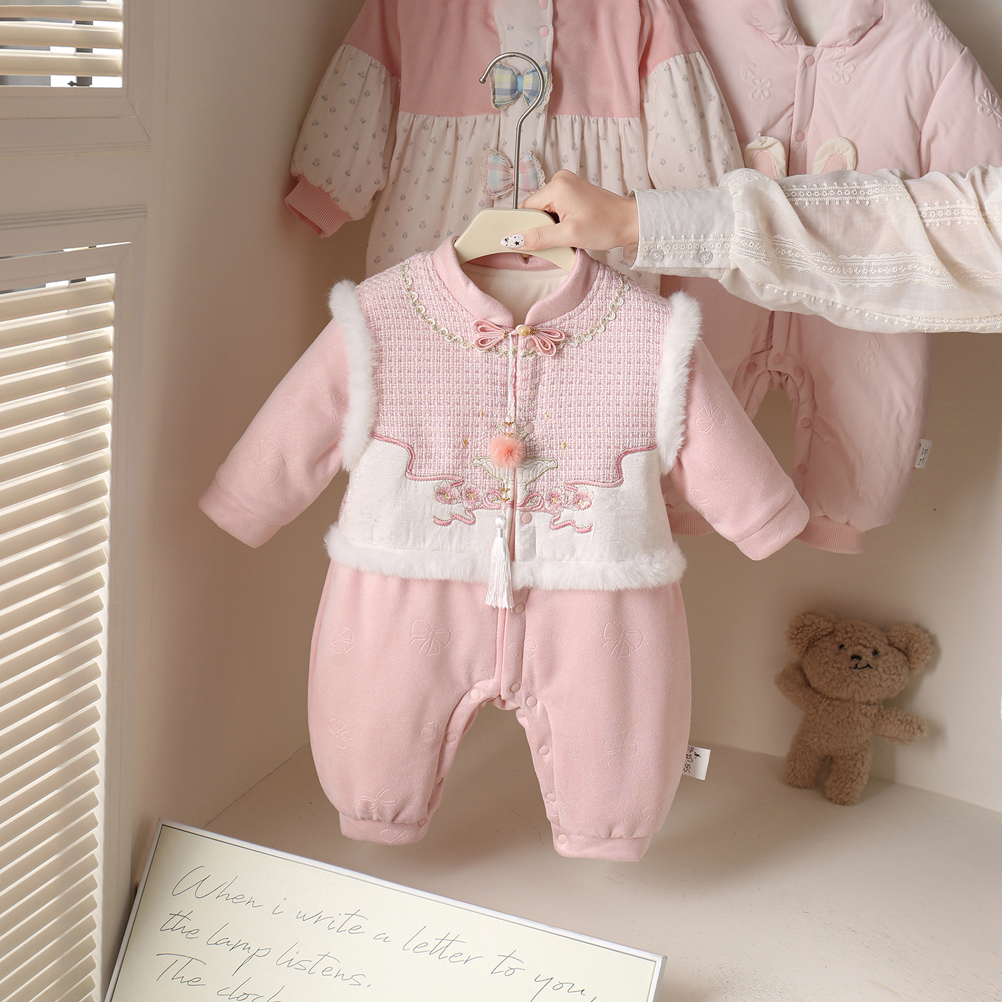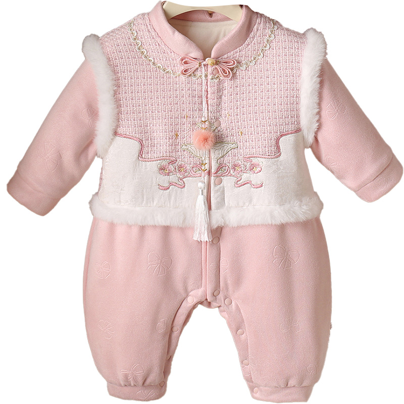 新生儿女宝宝冬装 连体衣夹棉国风哈衣婴儿秋冬满月百天抓周岁礼服