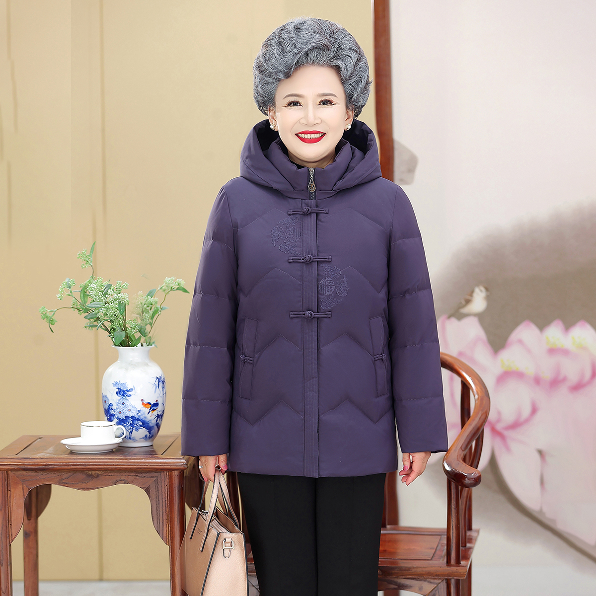 保暖宽松连帽中老年 暗花羽绒服盘扣奶奶装 雪中飞2025冬新款 中式