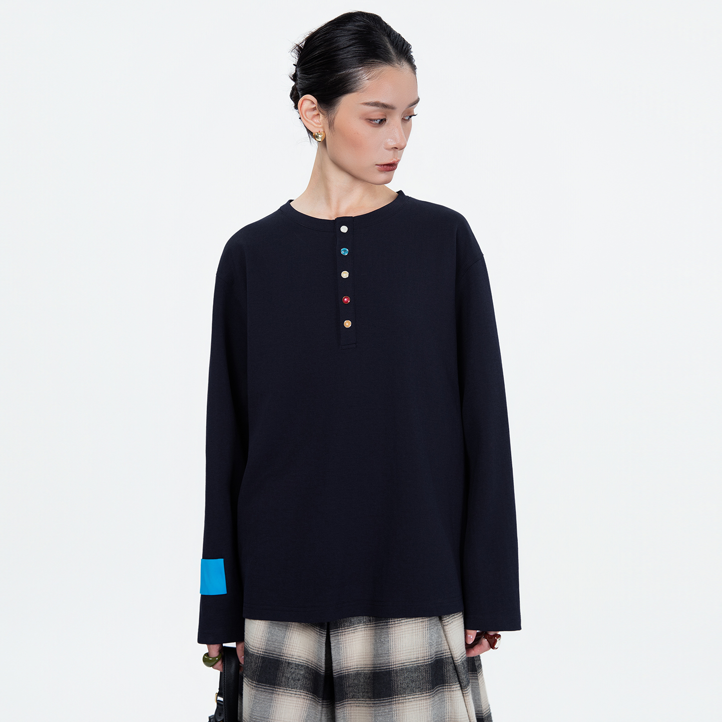 长袖 ALL 藏青色彩扣亨特领打底衫 新款 T恤女 BEINGS2025AW秋季