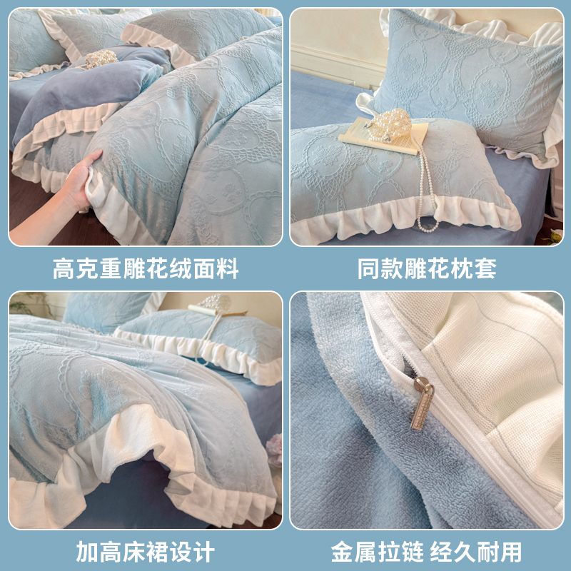 公主风牛奶绒四件套双面加绒加厚珊瑚绒花边款 床单床笠床上三件套