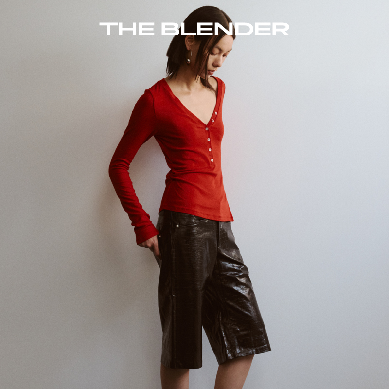 Blender25秋深V不对称亨利领可叠穿修身 The 红色打底衫 新品