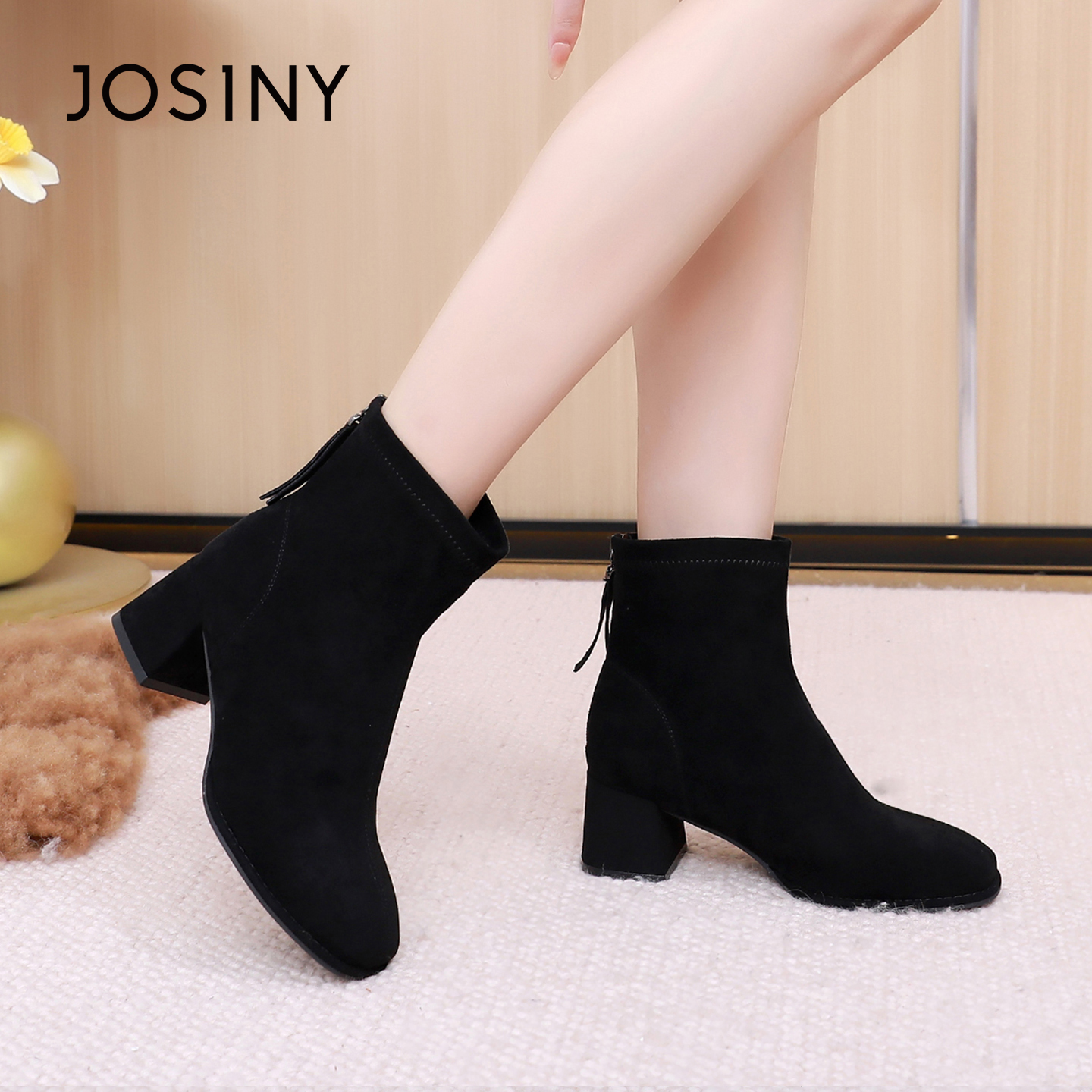 卓诗尼2025秋冬新款 舒适气质显瘦绒面女靴潮流瘦瘦靴 粗跟短靴时尚