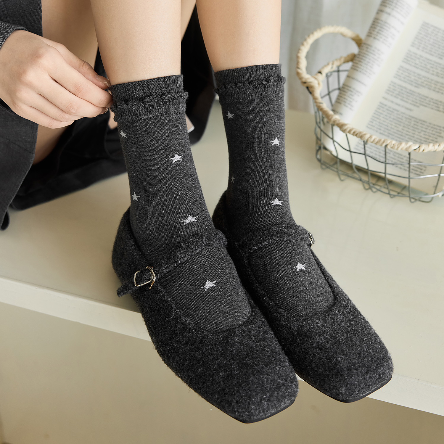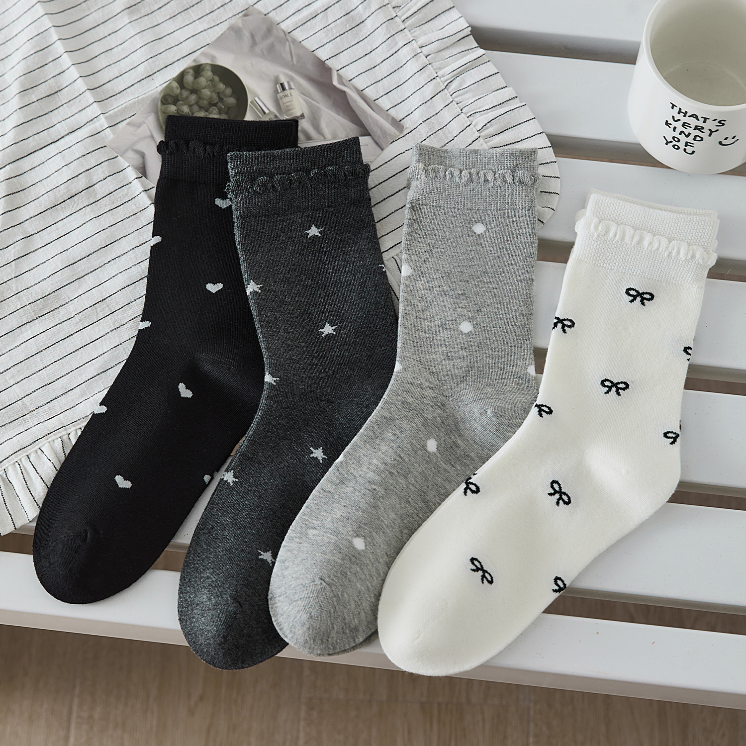 杭臻花边袜子女中筒袜春秋季 纯棉双罗口日系蝴蝶结百搭堆堆袜长袜