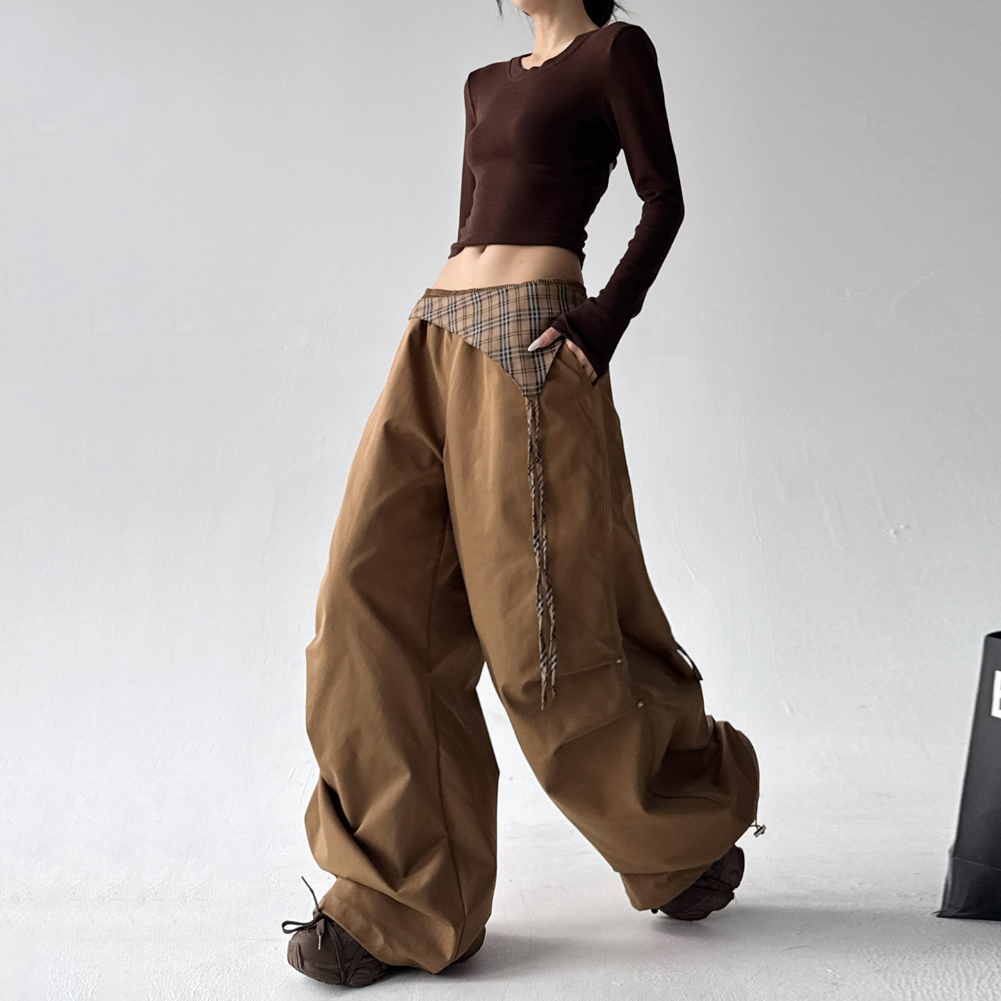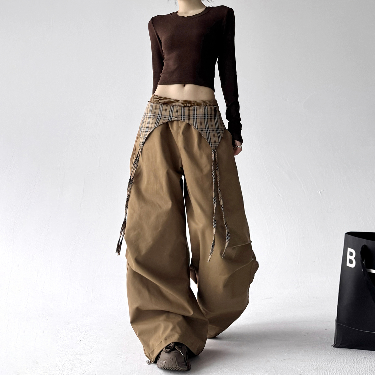 潮流高街个性 时尚 工装 裤 潮 2025年秋季 女休闲通勤拼接格纹长裤 新款