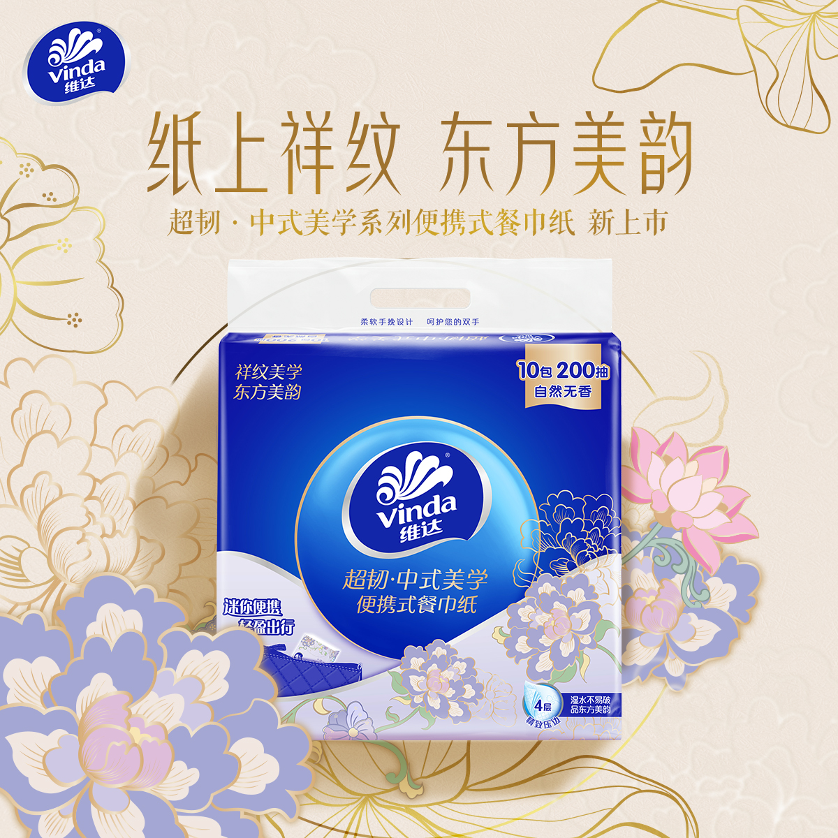 维达超韧中式 餐巾纸面巾纸亲肤纸巾餐巾纸 美学小方巾4层便携式