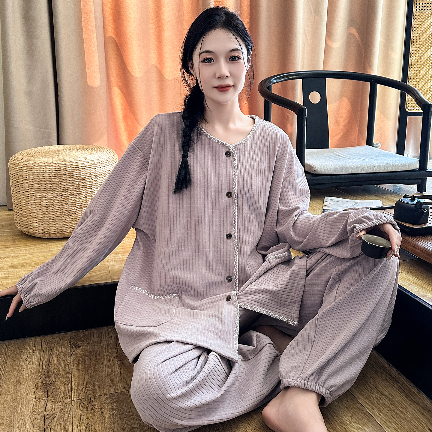 条纹保暖牛奶绒女家居服套装 Gukoo 果壳睡衣女卡通印花新款