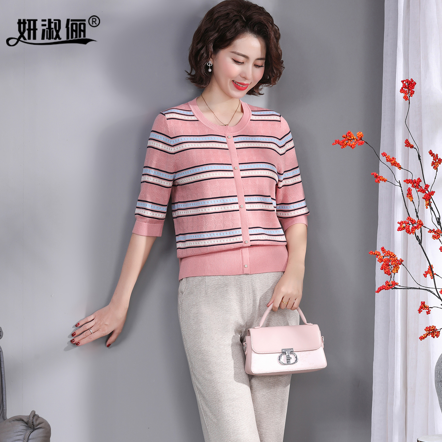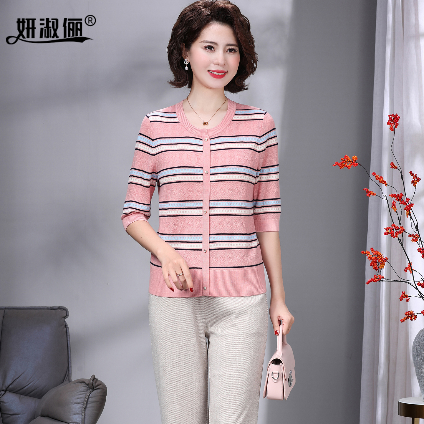 子套装 50岁妈妈秋季 条纹高档裤 减龄莱赛尔针织衫 天丝上衣2025新款