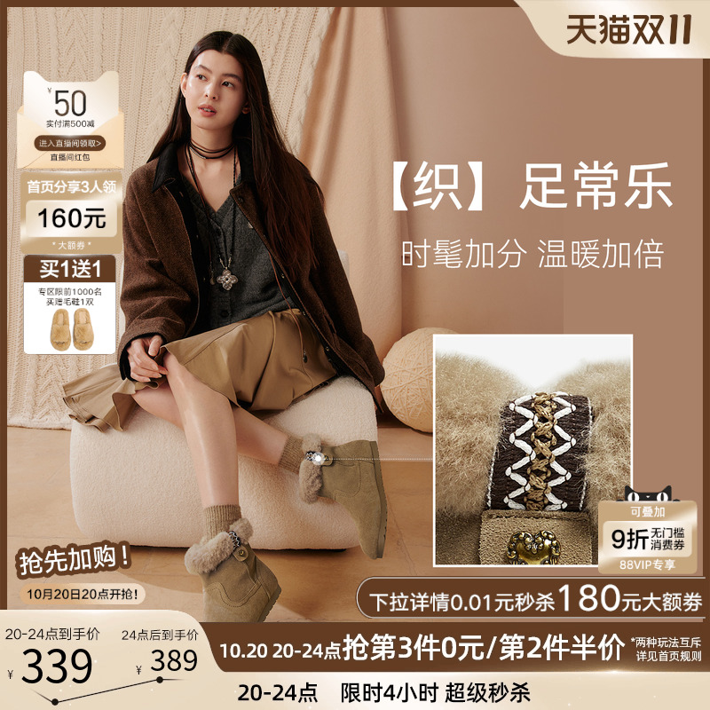 百思图2025冬新款 女短靴F1061DD5 真皮毛毛雪地靴加绒保暖加厚棉鞋