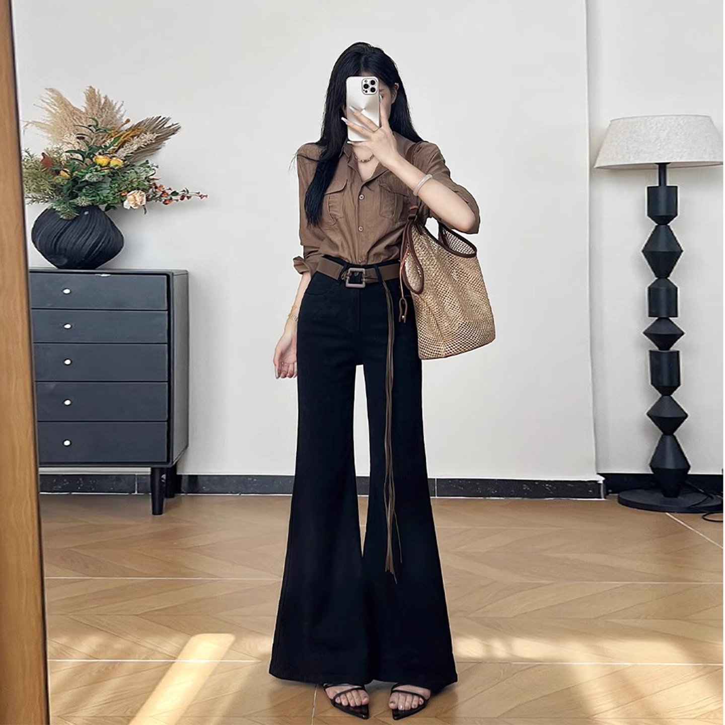 女2025新款 子女装 秋季 复古喇叭裤 504897 铆钉毛边微喇裤 三福牛仔裤