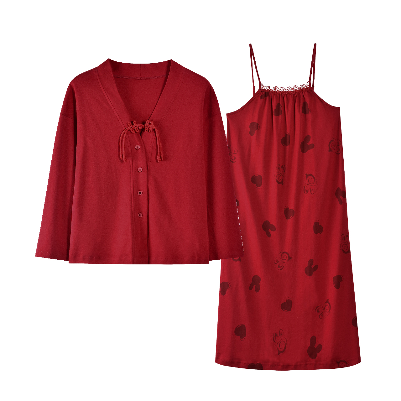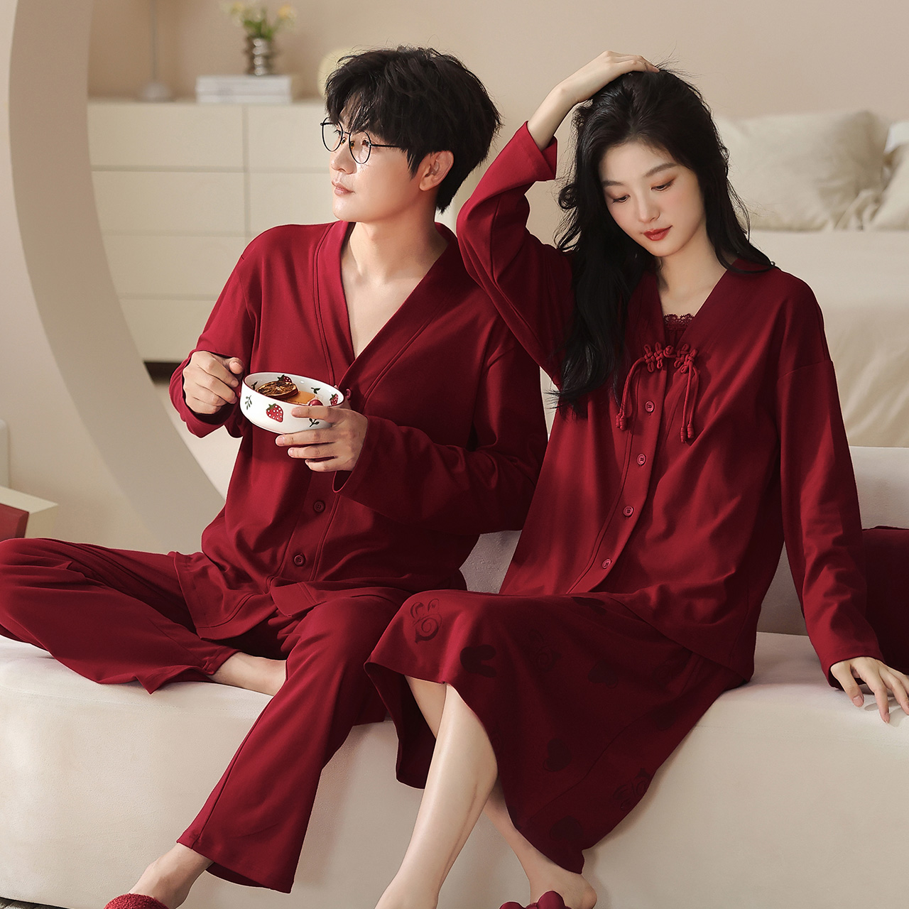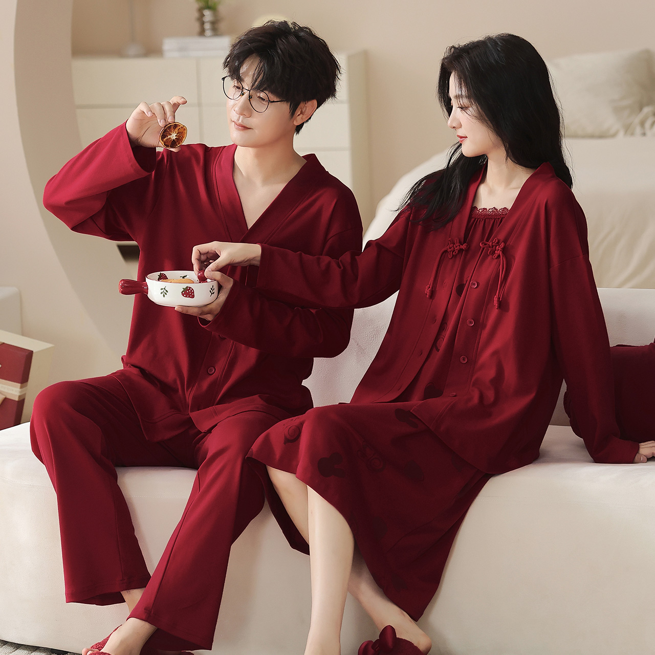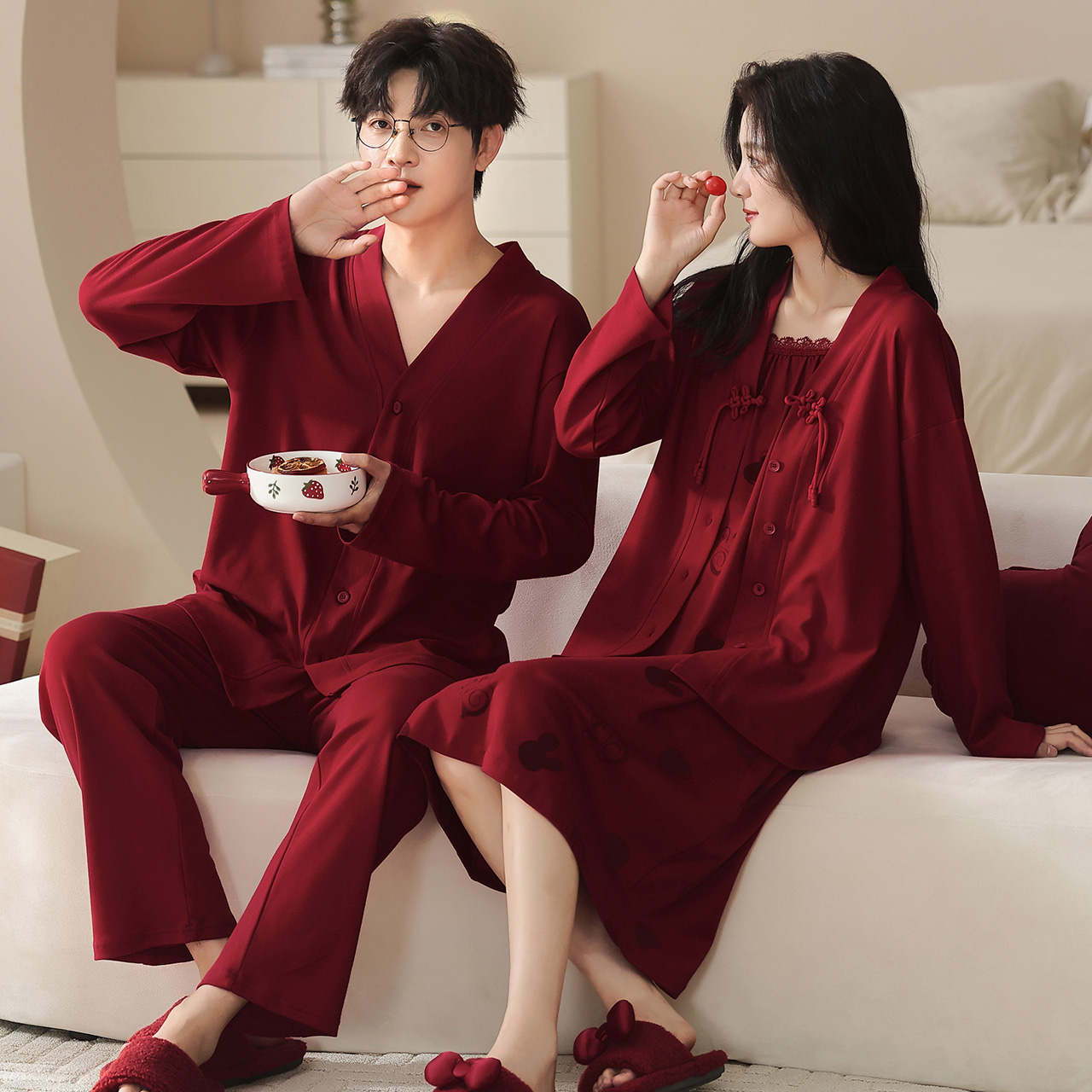 女方陪嫁 一对男士 红色纯棉睡衣结婚新婚情侣套装 新人晨袍睡袍拖鞋