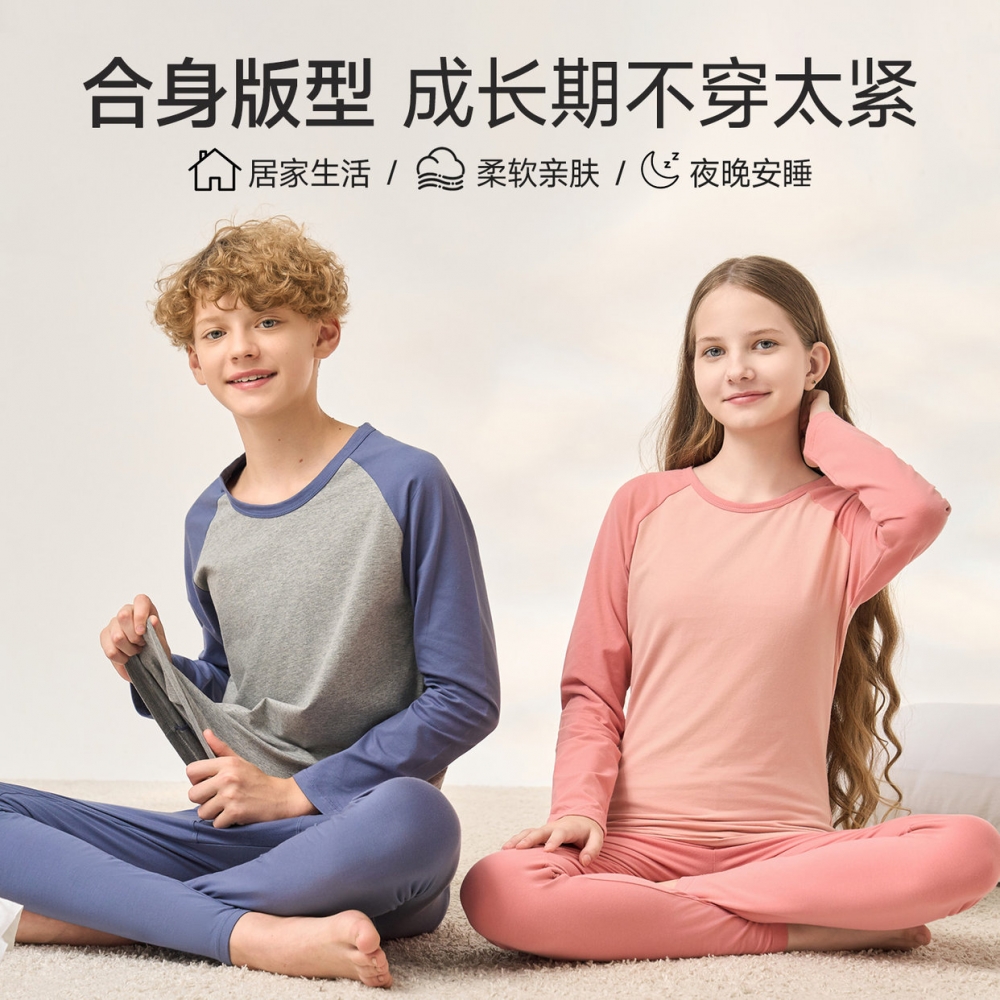 婷美青少年纯棉打底保暖内衣套装 中大男童女童纯色家居服秋衣秋裤