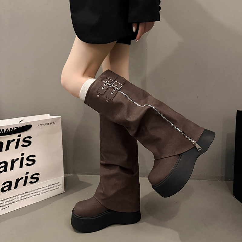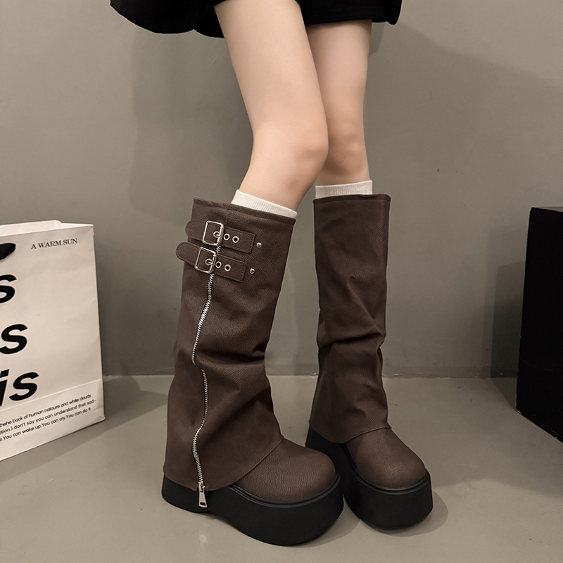 厚底增高长筒靴女2025秋冬新款 管堆堆松糕高筒骑士靴 小个子甜酷裤