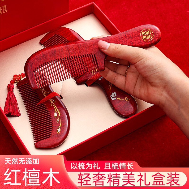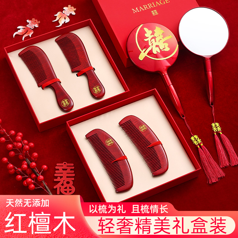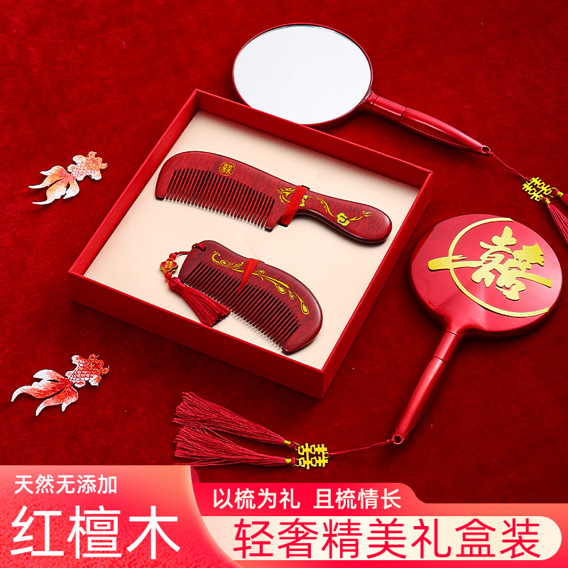 结婚梳子镜子一对檀木梳新婚礼物新娘陪嫁妆订婚对梳礼盒婚庆用品
