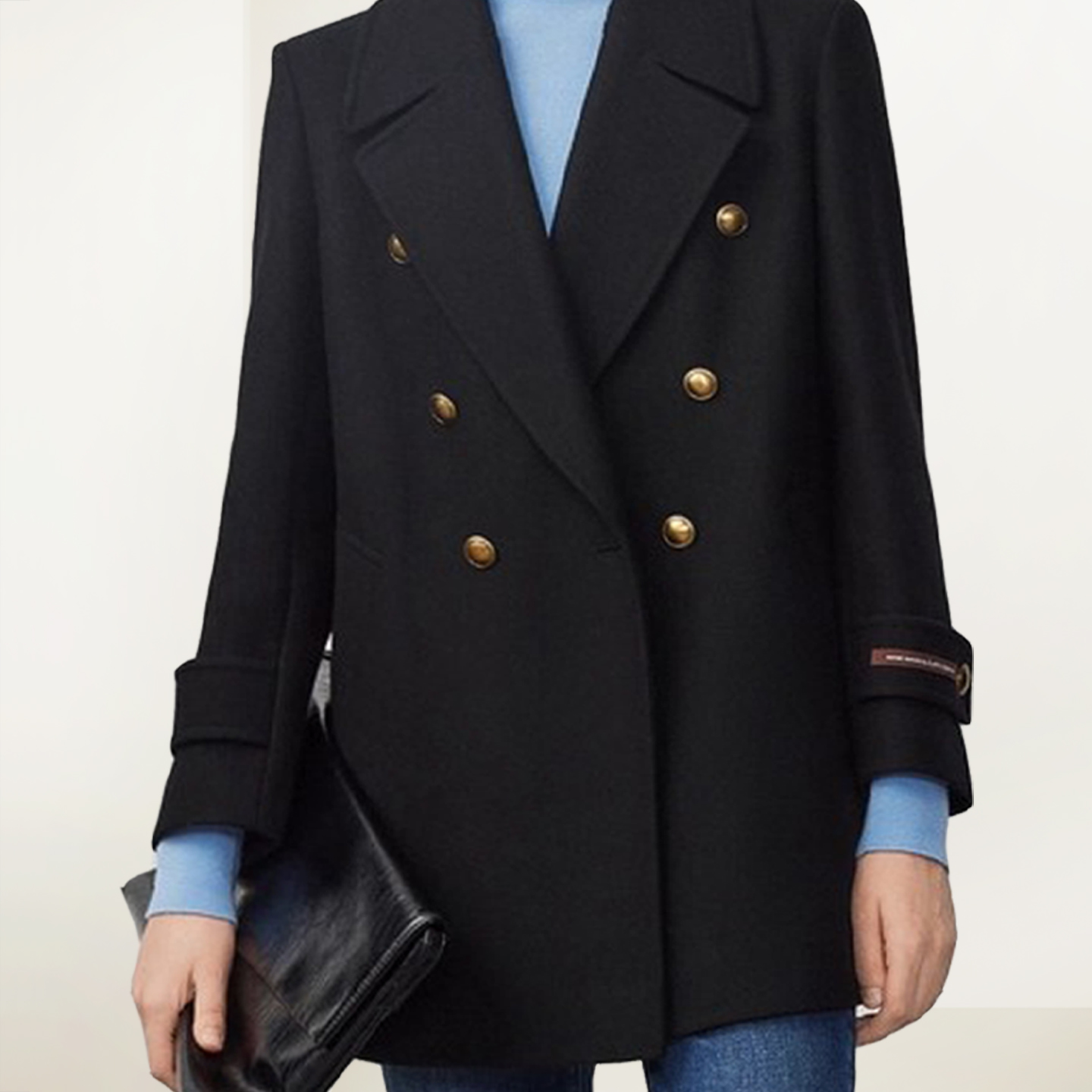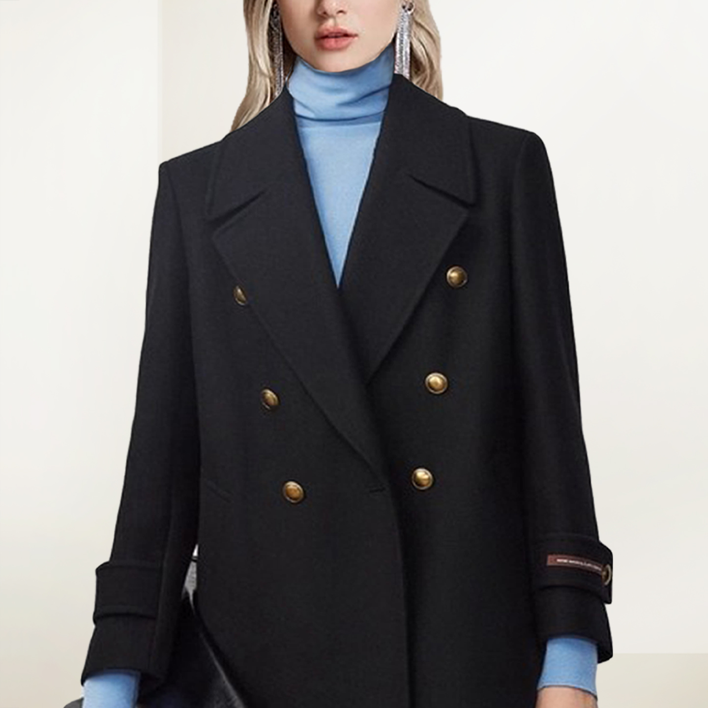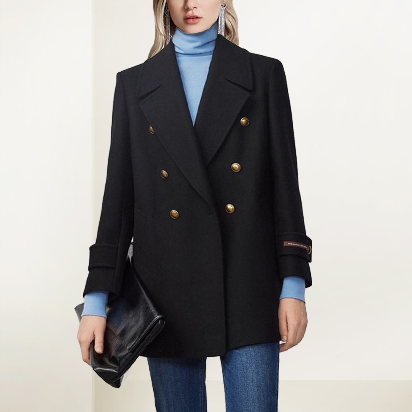 通勤轻商务西服 2025秋冬黑色时尚 QOOEL复古双排扣中长款 外套女装