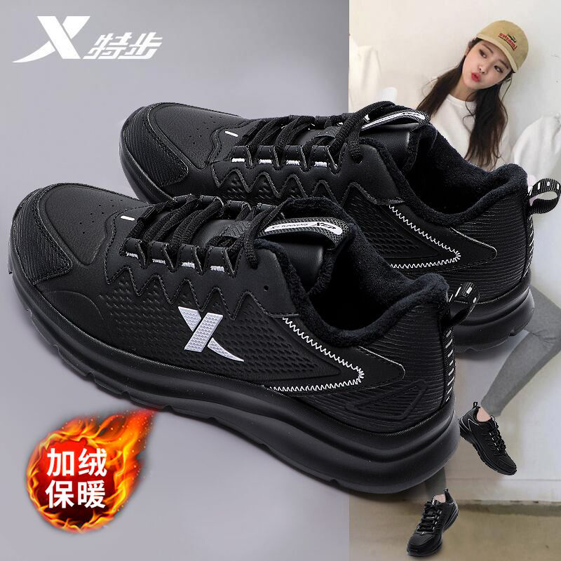 女2025新款 加绒运动鞋 正品 休闲鞋 特步黑色女鞋 防水皮面二棉鞋 冬季