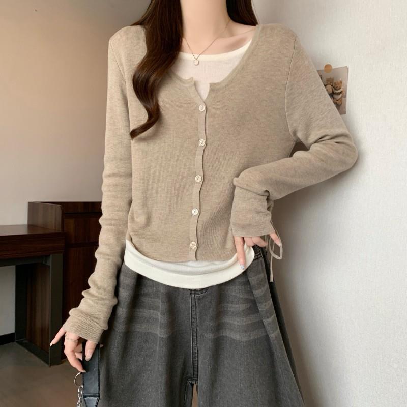 刺绣设计感宽松针织衫 新款 上衣 女2025秋季 紫涵圆领假两件毛衣开衫