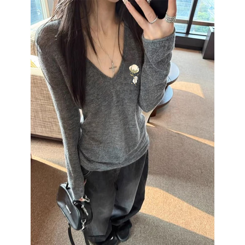 收腰显身材紧身上衣服 内搭打底衫 正肩v领长袖 磨毛T恤女春秋冬修身