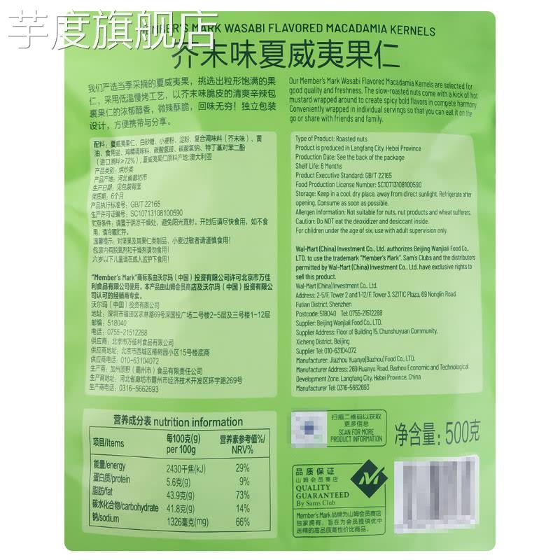 山姆会员超市代购 官方旗舰店芥末味夏威夷果仁烘焙咸蛋黄坚果500g