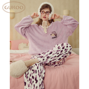 女家居服秋冬保暖加绒男套装 宽松大码 珊瑚绒情侣睡衣韩版 曼系冬季
