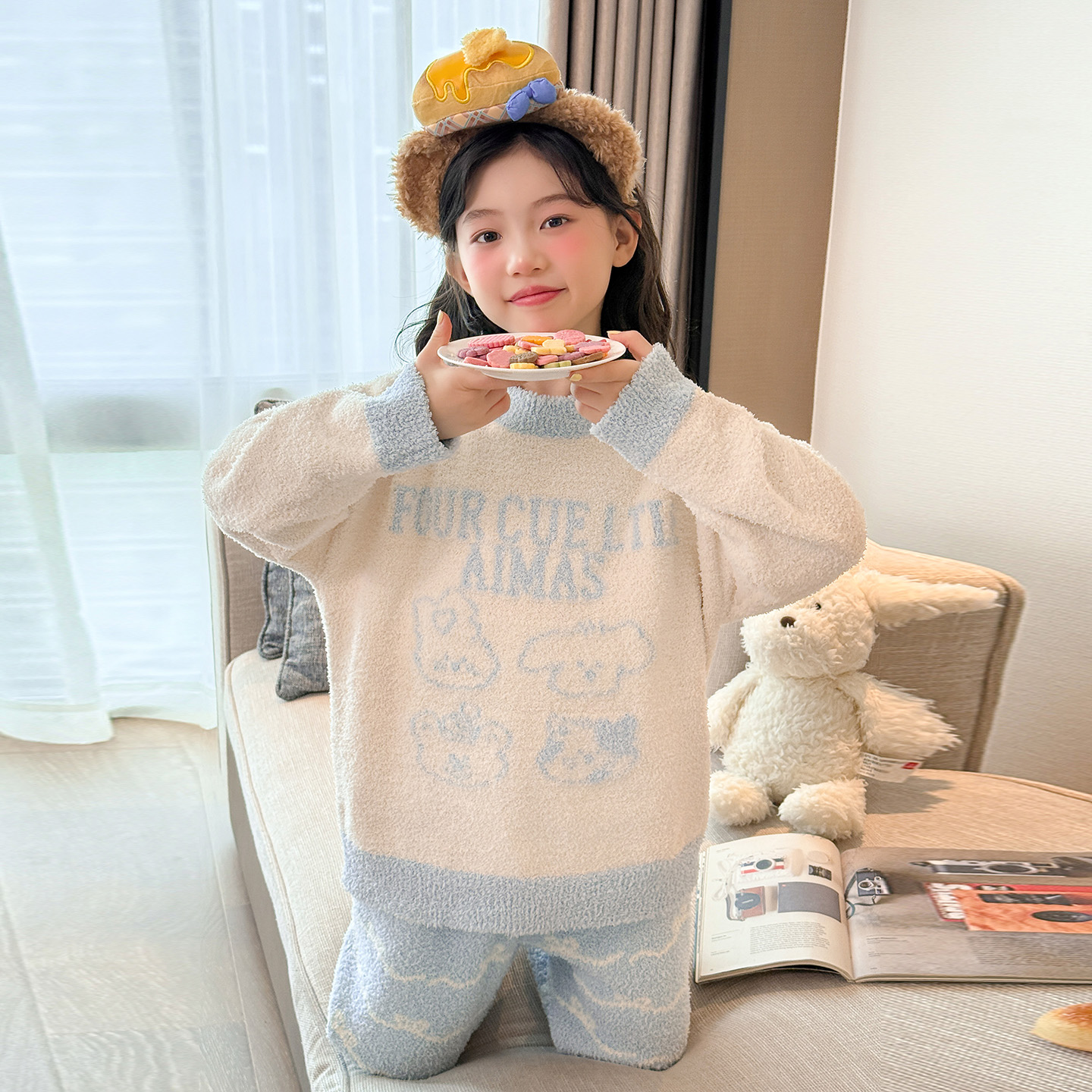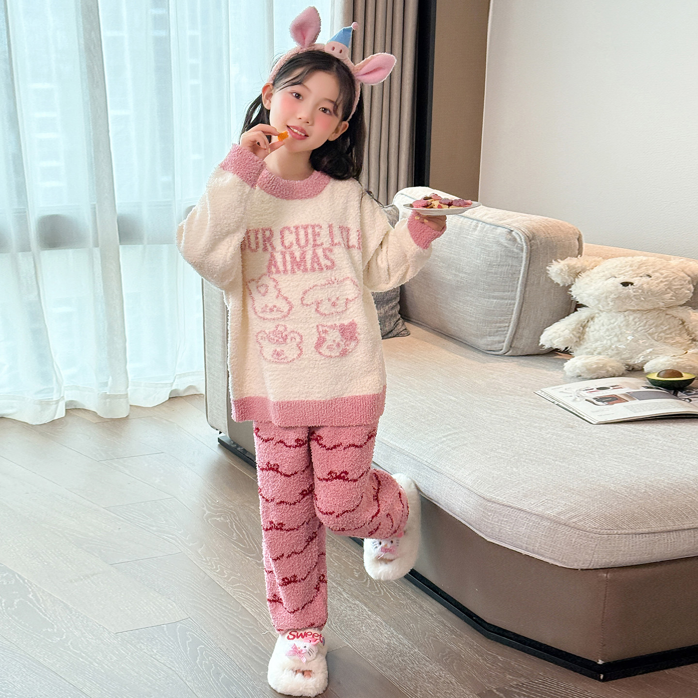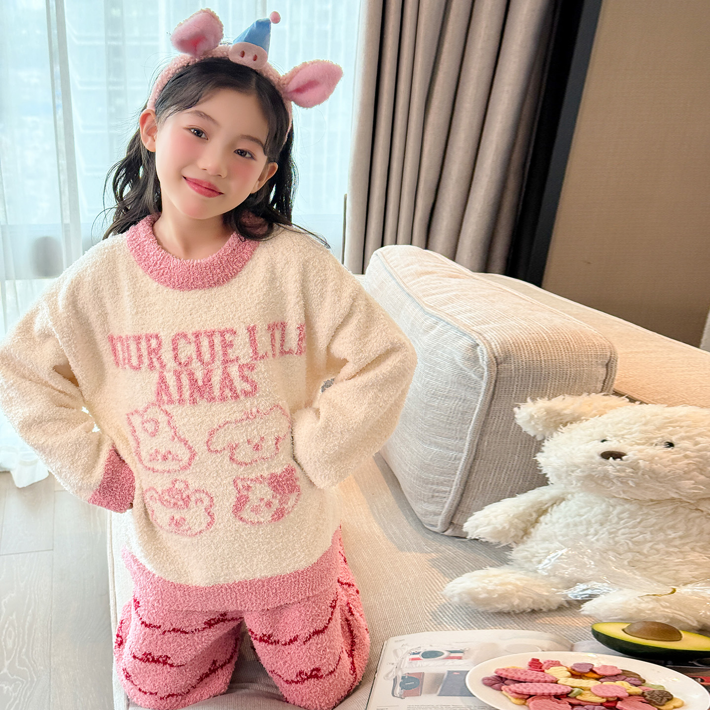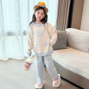 女童半边绒家居服青少年女孩加厚珊瑚绒套装 儿童睡衣冬季 2025新款