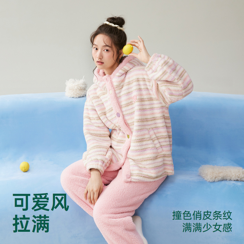 可外穿珊瑚绒家居服女抗静电冬季 红豆居家女士羊羔绒睡衣套装 开衫