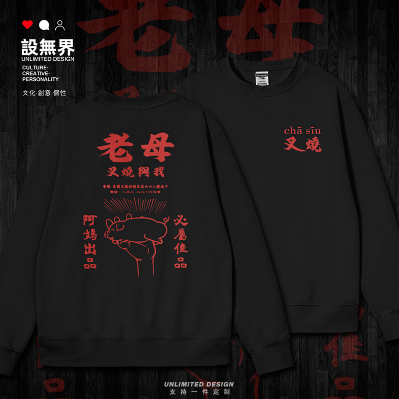潮设 春装 无界 加绒帽衫 掌上明猪母亲节粤语趣味连帽卫衣男女个性