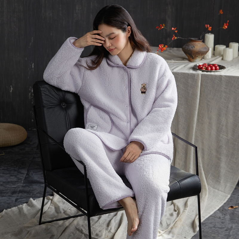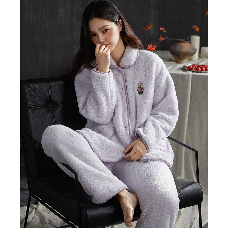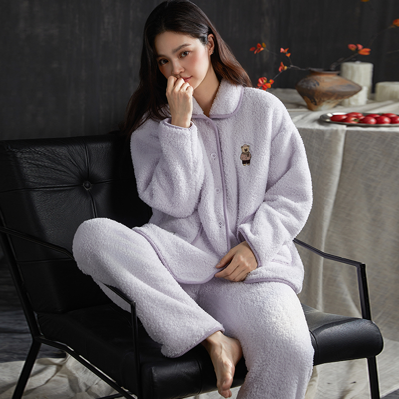 翻领卡通小熊紫色女可外穿加厚加绒保暖家居服套装 2025新款 秋冬季