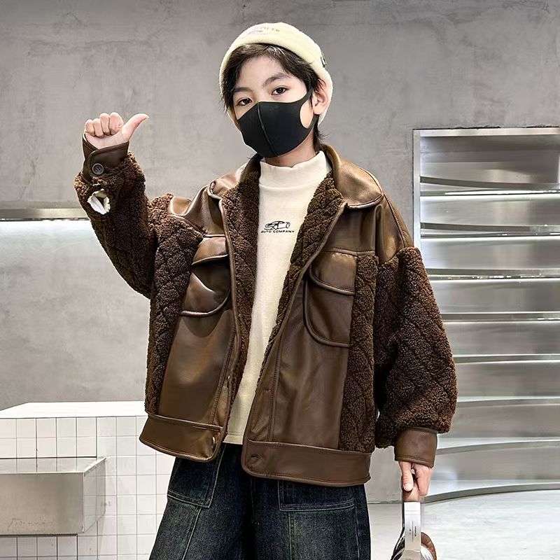 2025年加厚男童宝宝儿童秋冬款 皮毛一体外套帅气皮衣机车服皮夹克