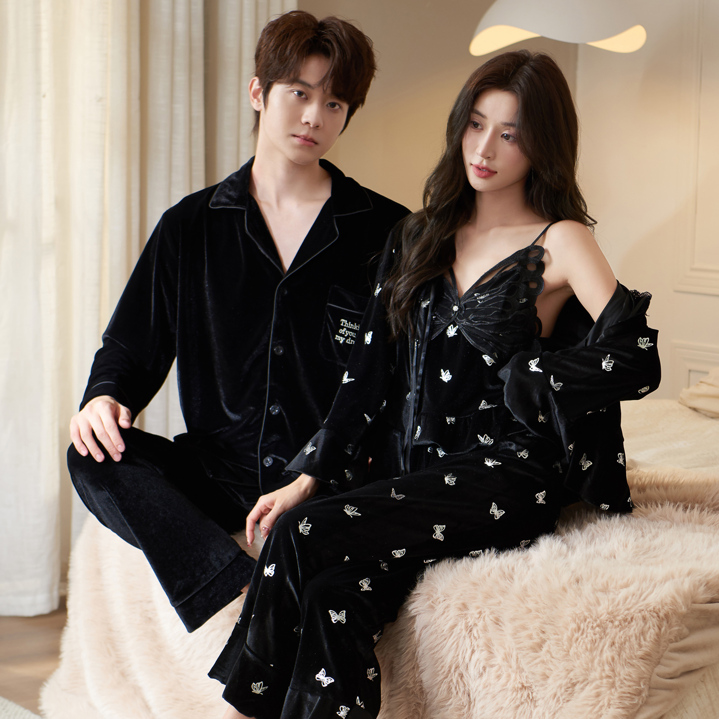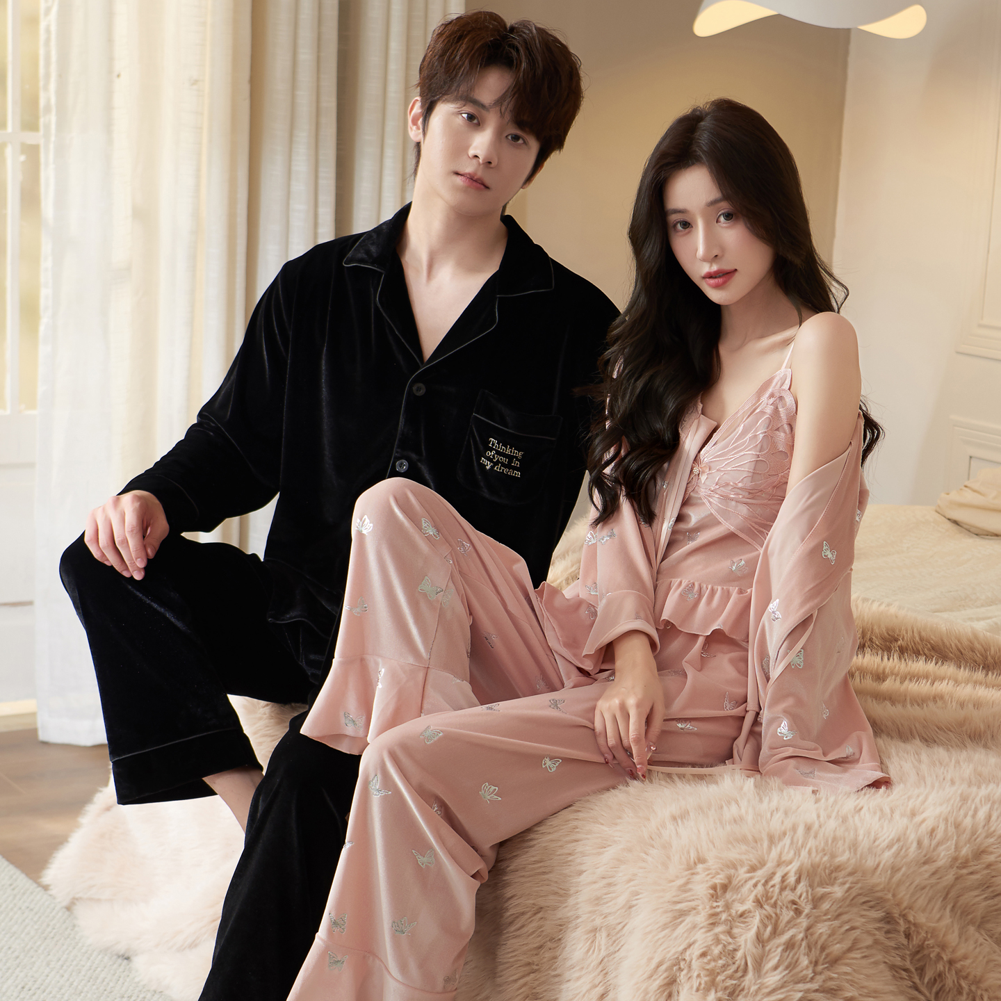 乐姿梦蝴蝶金丝绒情侣睡衣秋冬季 男女士可外穿家居服 吊带三件套装