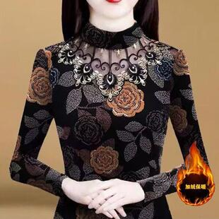 t恤小衫 女内搭黑色网纱长袖 上衣胖mm秋冬h 半高领蕾丝打底衫 大码